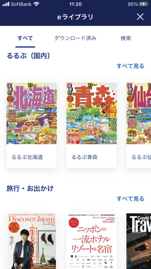 そうするとeライブラリという画面になるので、少し画面をスクロールすればるるぶが見つけられるはずです。ダウンロードして読むことができます。