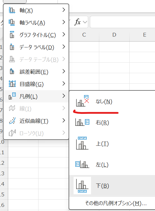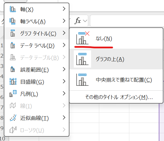 グラフタイトル、凡例共に「なし」を選びましょう。