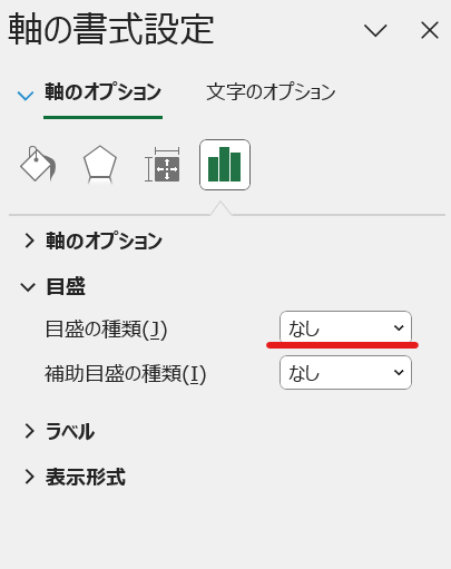 以上の3か所を選択した状態で軸の書式設定の線色を黒に変更しましょう。めんどくさい、、、