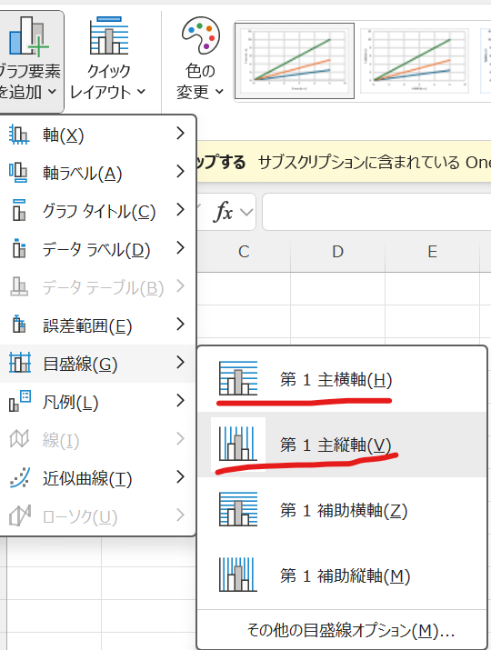 グリッド線については、データによっては見やすいと思うこともあるのですが、論文の図面では使われないことが多いので、これも消します。これはリボンのグラフデザイン→グラフ要素の追加→目盛線から変更できます。