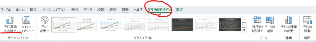 グラフを選択した状態でリボンを見るとグラフデザインタブがありますので選択し、グラフ要素を追加から消すことができます。