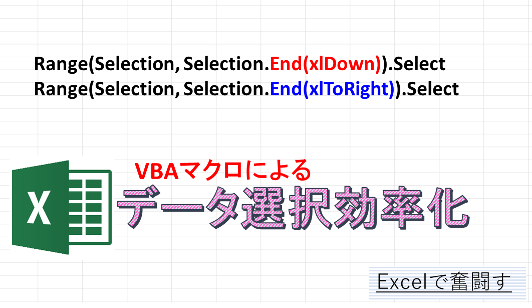 ()の中身がSelection, Selection.End(xlDown)になっていますが、これは今選択しているセル(Selection)から今選択しているセルから下方向終端(Selection.End(xlDown))いう意味です。