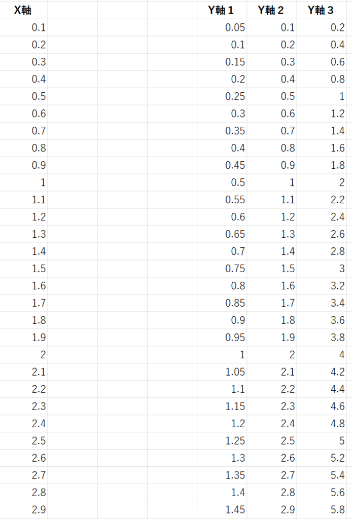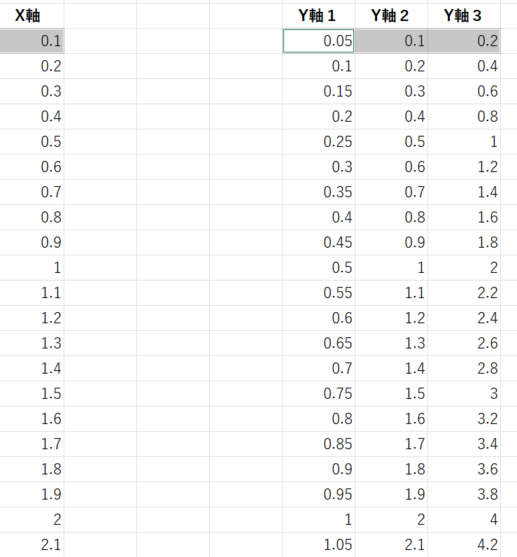 X軸と離れた箇所にわざわざY軸のデータを並べるか?と思うかもしれませんが、実際によく使うのは、X軸の横にY軸が並んでいるが、その一部をグラフにしたい場合です。全データを並べるとごちゃごちゃしてしまう場合や、一部の失敗測定データを除外する場合など様々なケースで有り得る使い方だと思います。