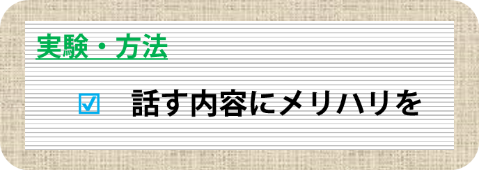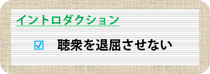 イントロの話し方は非常に重要です。ここで聴衆を退屈させてしまえば、ほぼ聞いてもらえないと思っていいです。聴衆の中には昨夜遅くまで居酒屋で飲み歩いていた人も少なくありません。「できれば寝ていたい」と思っている人もいるはずです。なにより、イントロをきちんと聞いていないとこの後の結果の話も分からないので、「イントロを聞き逃した」=「ここは聞かずに次の発表を真面目に聞こう」となりがちです。