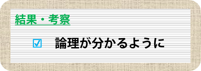 上記の説明をもとに何らかの結論を導きます。場合によってはその結論をもとに次の実験を行ったというような説明も加えられます。