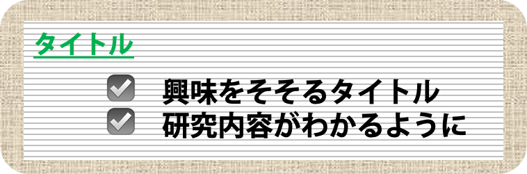 いくら読者の関心を引きたいと言っても、タイトルから内容が全く想像できない内容では逆に敬遠されてしまいます。何と言っても科学論文ですから。タイトルの中には具体的な内容を示唆する言葉が2つは使われているでしょう。例えば以下のような項目です。