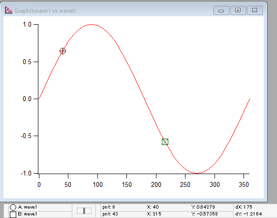 また、カーブフィットをする際などには、グラフの一部をフィッティングする際の範囲の指定にこのカーソルが使えます。