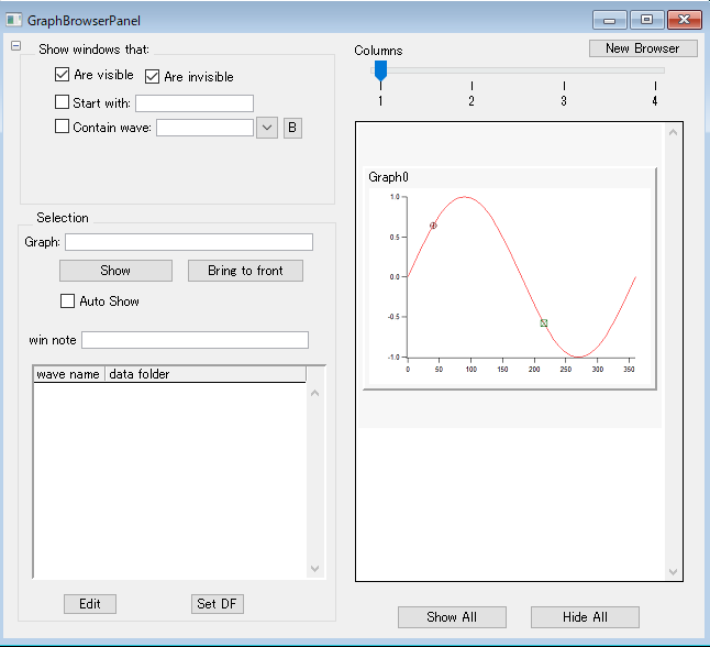 下図のような画面になっており、右側の画面にそのIgorファイル内のグラフが表示されます。この画面ではグラフが1つしかないのであまりメリットがありませんが、データがたくさん増えてくるとグラフが大量にできてしまいますし、本質的には同じグラフでも書式のバージョンが異なる(カラーとグレースケールなど)グラフを作り始めると収拾がつきません。このGraph Browserを使えば、大量のグラフの中から目当てのグラフを見つけることも簡単だと思います。