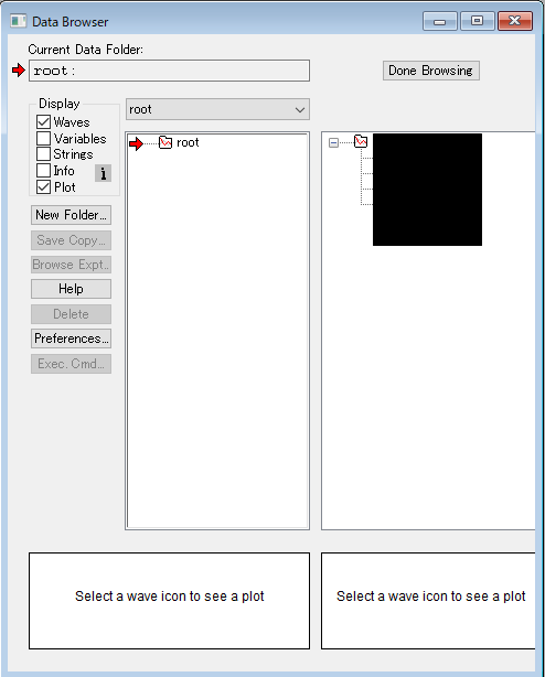 ファイルを選択すると上図のような画面になります。黒塗りの部分に選択したファイル内のデータが表示されます。表示されたデータをドラックして左側のrootに入れると、現在使っているIgorファイルにデータが読み込まれます。