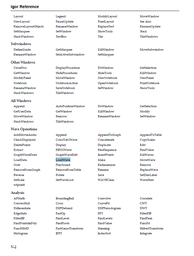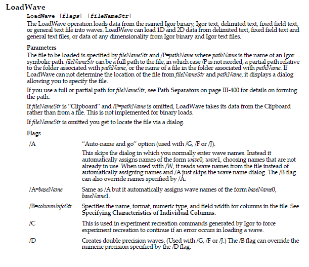ここで”LoadWave”と検索すれば下図のようにLoadWaveが検索にかかり、ハイライトされます。このLoadWaveはリンクになっており、Loadwave関数の使い方の説明のページに飛べます。