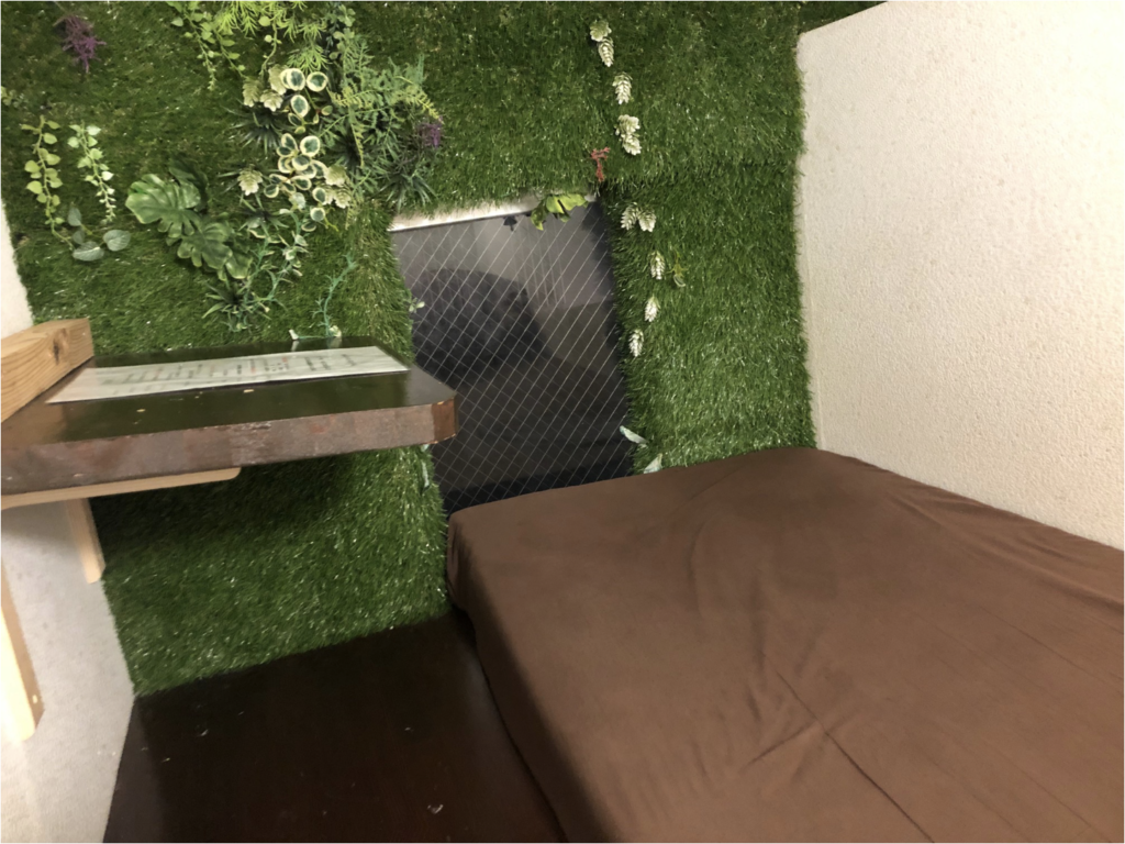 部屋は簡素な壁で仕切りを作っている。防音性は悪いが、部屋は清潔な雰囲気で気になる臭いなどもない。小さいながらテレビも付いている。