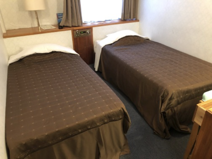 建物はかなり老朽化していますが、いかにもホテルという感じで、これまで泊まったホテルとは違います。部屋に入って、まず広いなと思いました。通常のビジネスホテルチェーンの部屋よりも一回り大きい印象です。私は一人で泊まりましたが、ツインの部屋でした。ツインの部屋しかないのかたまたまなのかはわかりませんでした。