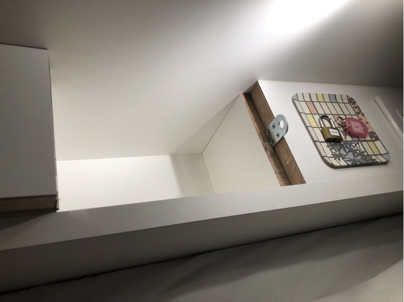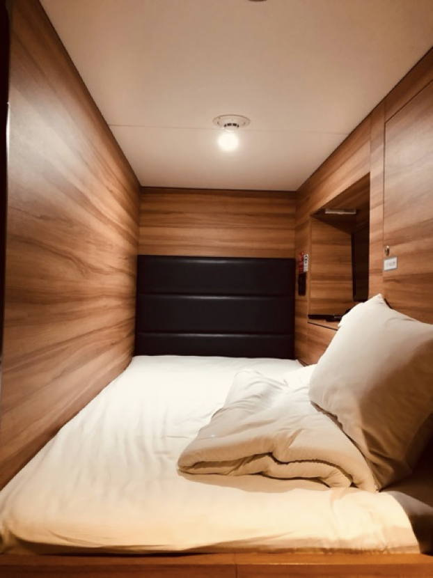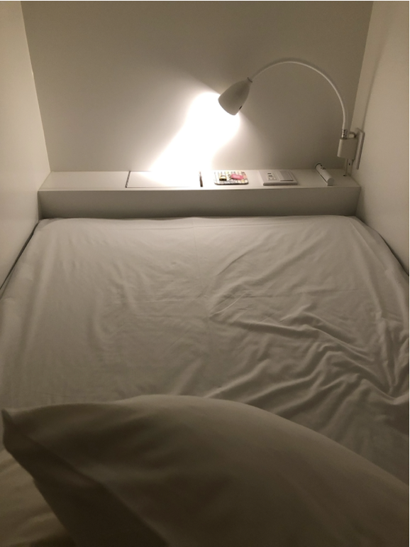 予約サイトの画像などを見ると二段ベットが並んでいるだけに見えますが、実際には普通のカプセルホテルのベッドで、入口以外は壁になっています。入口はロールカーテンで仕切られているだけなので防音性はほとんどありません。