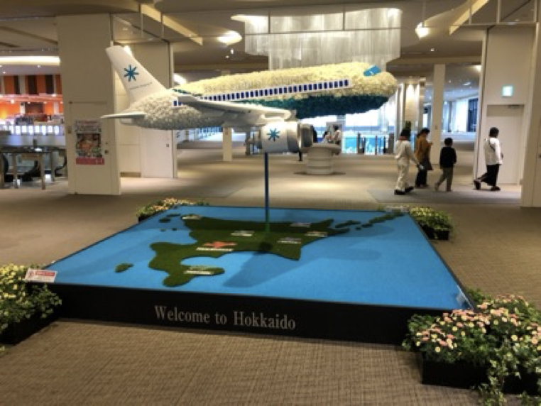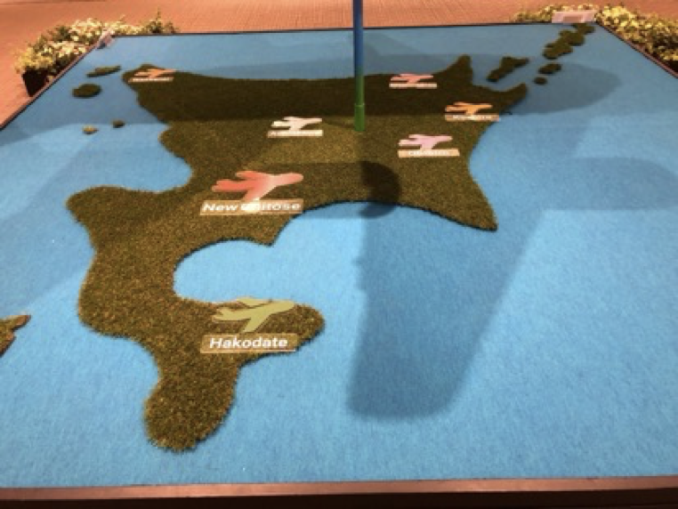 空港と温泉が向かい合った場所にあるのですが、その中央に飛行機のモニュメントが設置されていました。よく見ると下の北海道の地図に北海道の空港が記載されています。北海道の空港の多さがわかります。