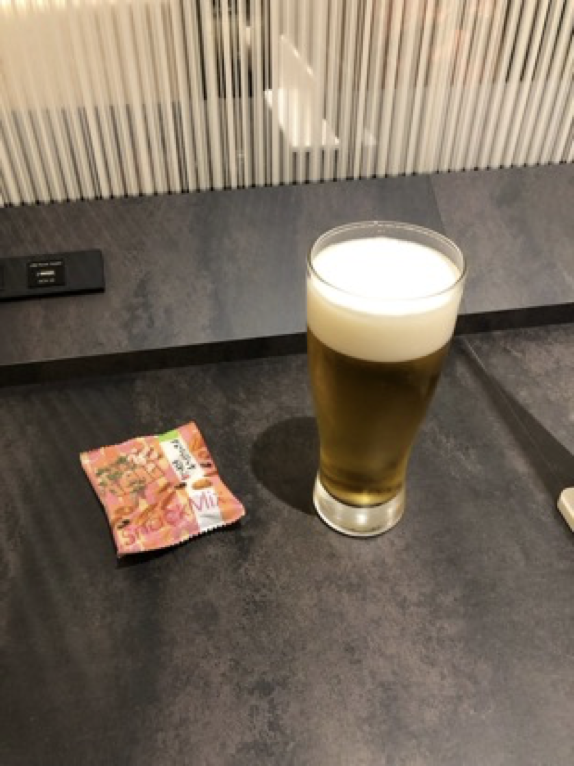 いつものおつまみのおかきと共にサッポロビールを飲みます。プレミアムクラスの機内ではミックスナッツもあり、私はそちらの方が好きなのですが、ラウンジにはありません。