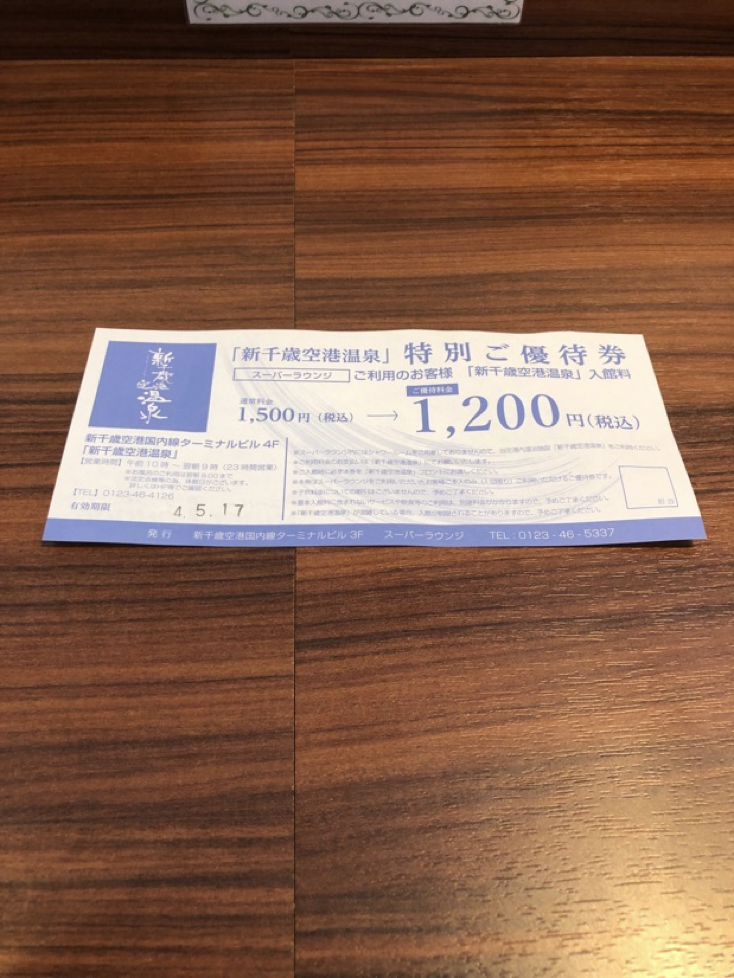 このラウンジには新千歳空港温泉の割引券があるからです。私が訪問した際には入口の受付の横に置いてあり、一声掛けて、もらいました。